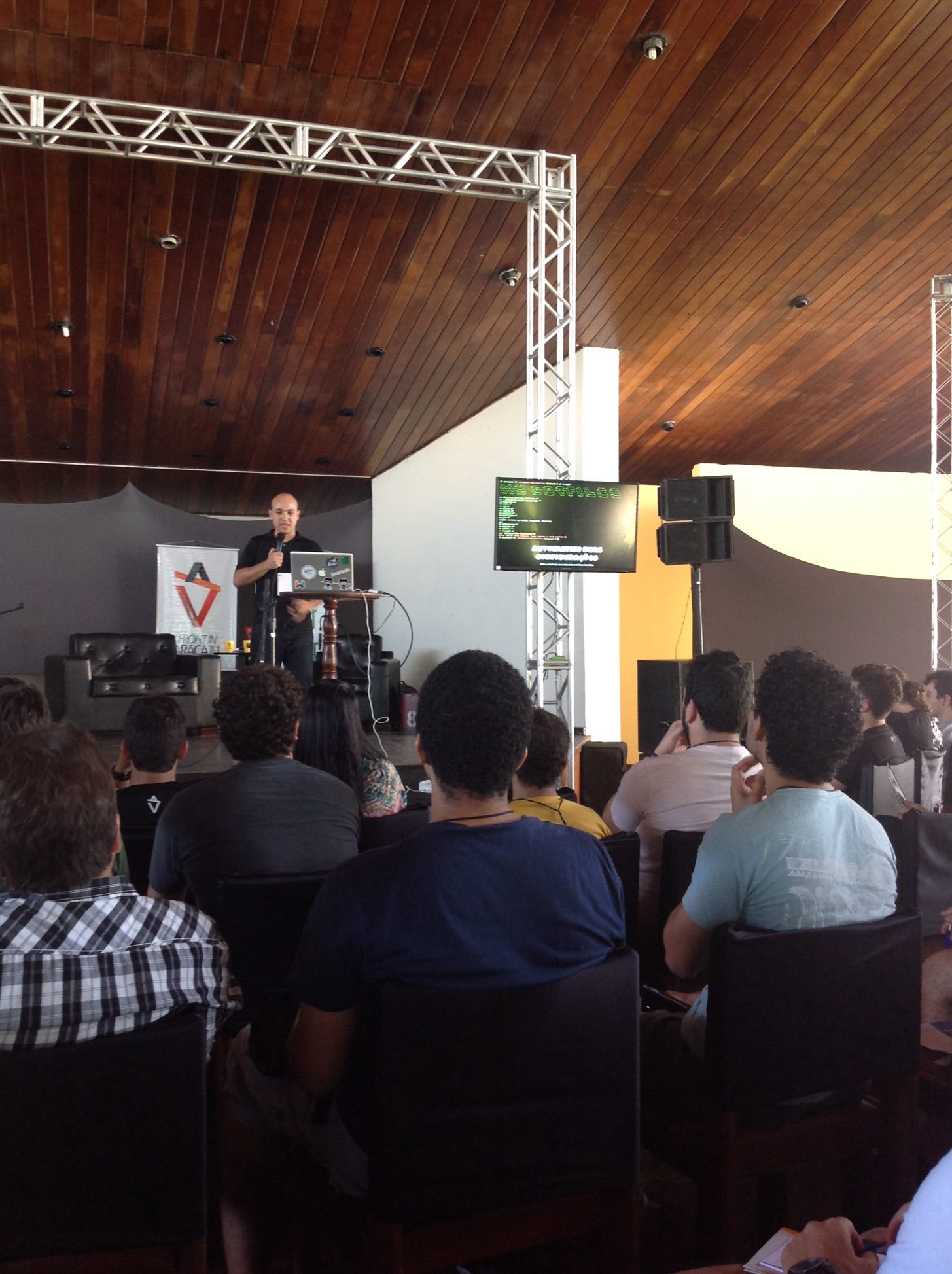 Iniciou contando sobre sua trajetória antes de iniciar no terra (que foi na Mc Donalds), falou sobre o BrazilJS e o que ele poderia ser se não fosse desenvolvedor.